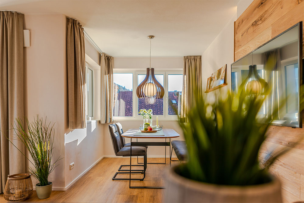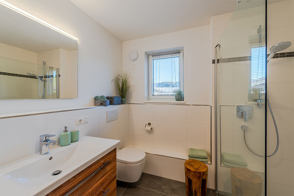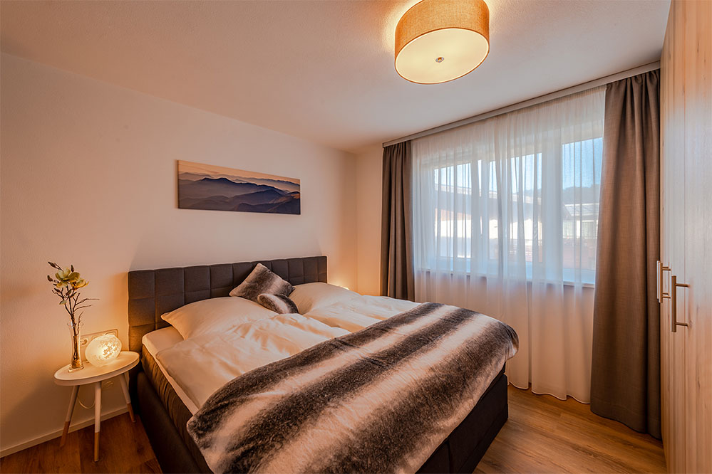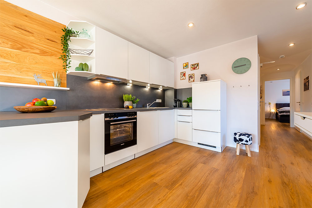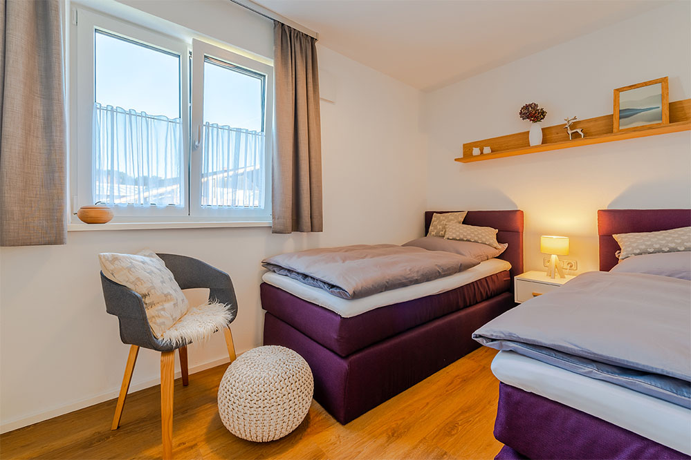 Sie wohnen in einer Wohnung im modernen, alpenländischen Stil mit offenem Wohn-Essbereich und voll ausgestatteter Küche (Spülmaschine, Backofen, Nespresso-Maschine, Toaster, Eierkocher uvm.). Sie befindet sich im 1. OG und bietet ein Doppelzimmer mit Boxspringbett, weiteres Zimmer mit zwei getrennten Boxspringbetten (können zusammengestellt werden), ein Bad mit WC und Dusche, sowie ein separates WC.