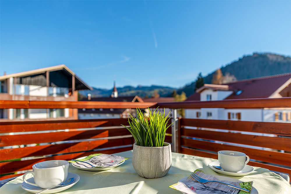 Einen nach Süden und Osten orientierten Eck-Balkon mit Blick auf die Berge.